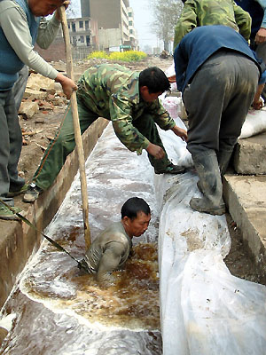 銀鴿排污渠沖破通向漯河市污水場污水渠隔墻,工人正在堵漏