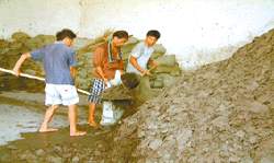 當?shù)剞r(nóng)民在裝運回收污泥