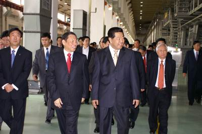中共中央政治局常委、全國政協(xié)主席賈慶林(右)等一行在新加坡金鷹國際集團董事局主席陳江和陪同下在車間視察生產(chǎn)情況。