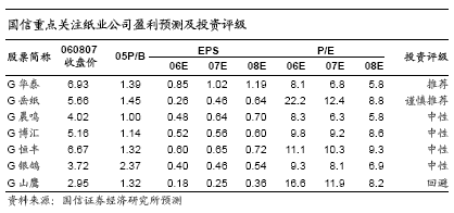 我們重申G華泰合理06P/E=11X,目前價值低估35%左右,維持“推薦”評級;G岳紙合理07P/E=16X,目前價值低估30%左右,維持“謹慎推薦”評級。其他公司價值基本合理或高估,維持“中性”及“回避”評級。我們同時維持行業“中性”評級。