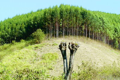 景谷縣鐘山鄉(xiāng)南景村弄令社馬家井桉樹無性系基地旁,齊刷刷的桉樹林與剛剛燒過的荒地形成鮮明的對比。