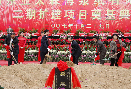 10月29日,山東亞太森博漿紙有限公司總投資113億元的二期工程——100萬噸木漿項目在日照奠基,項目建成后,將是目前世界上規模最大的紙漿生產線之一,加上第一期年產31.5萬噸的產能,亞太森博年產紙漿將超過130萬噸,這將使日照成為中國最大的紙漿生產基地。令人矚目的是,它不僅僅是山東省改革開放以來最大的利用外資項目,其環保投資也高達30億元,專家評價,各項環保指標將達到世界領先水準。