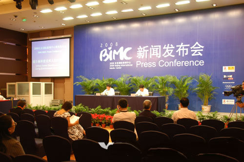 8月22日,2008北京國際新聞中心舉行城市森林建設與人居環境改善新聞發布會,國家林業局植樹造林司司長魏殿生介紹有關情況,并答記者問。圖為新聞發布會現場。