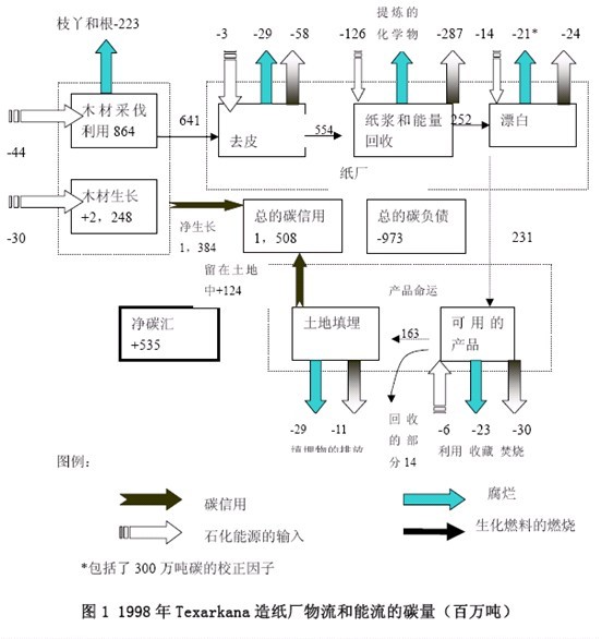圖1 1998 年Texarkana 造紙廠物流和能流的碳量(百萬噸)