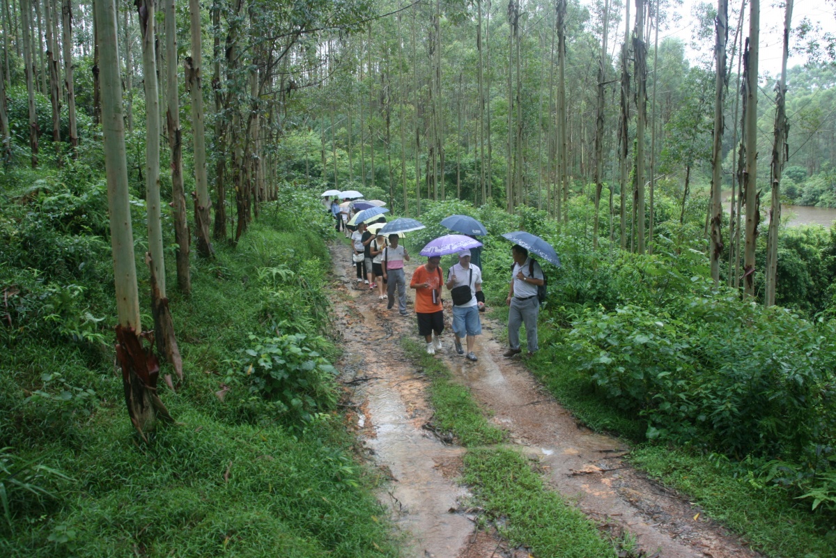 早上出發(fā)時天公不作美,欽州下起了綿綿細雨,但絲毫沒有影響到考察團到林區(qū)考察的熱情。為了更加了解桉樹人工林的知識及到實地考察桉樹的生長環(huán)境,考察團在主辦方的帶領下?lián)蝹闵钊虢鸸饧瘓FAPP在欽州所屬林地——茅坡林地進行考察。