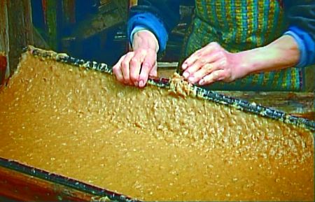因?yàn)殡S著造紙技術(shù)的不斷進(jìn)步,這種傳統(tǒng)的手工造紙法很難和先進(jìn)的技術(shù)競爭。造草紙的原料都是李高強(qiáng)自家種的竹子,他們用石灰水浸泡竹子,然后將竹子搗碎,將搗碎的泥面附于竹簾上面風(fēng)干,紙就成型了。李高強(qiáng)一家四口人工作一天才能造30公斤左右的草紙,市場價每公斤在3元左右。李高強(qiáng)告訴記者:“在四十年前,這紙還用來包面,現(xiàn)在基本只用來祭祀。”