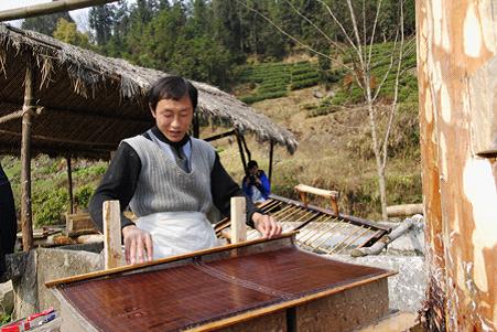“現(xiàn)在只有7戶咯!以前,新元一個(gè)寨子30多家,家家都靠這生活。”村民周繼才看著手中的澆紙工具對(duì)記者說(shuō),“據(jù)我家公(祖父)回憶,他的前兩輩就已經(jīng)會(huì)造紙了,這樣一算,新元做皮紙至少有5代人以上的歷史。”
