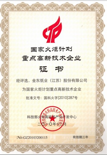 近日,金東從科技部門領取了“國家火炬計劃重點高新技術企業”證書(編號GZ20103200115),成為全國造紙行業率先通過國家級重點高新技術企業認定的企業。這是自2008年新的《高新技術企業認定管理辦法》實施以來,首批按新標準認定的國家火炬計劃重點高新技術企業。