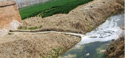 2011年3月31日,我們來到位于河南省商丘市虞城縣利民鎮三里井村委會附近的造紙廠,工廠大門前并沒有顯示廠名牌子。在當地村民的帶領下,我們來到造紙廠后面的排水通道,一股刺鼻的味道撲鼻而來,據當地人介紹,紙廠排放的污水從墻下的一段排水道源源不斷的流進本應是灌溉田地的灌溉渠里。