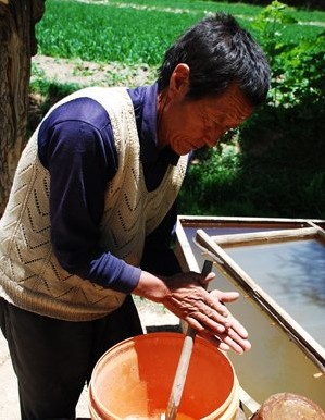 將漿料倒入注有水的容器中,用雙手飛快搓動木棒,使紙漿懸浮均勻