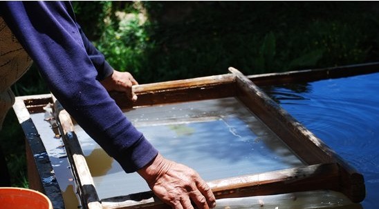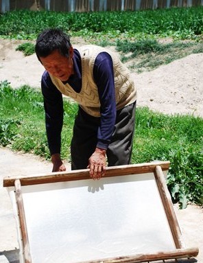 今年61歲的次仁多杰從15歲開始學習手工制作藏紙,并堅持至今。他告訴記者,藏紙的制作有六道工序:用刀子將狼毒草根部去皮去芯;取中間白色纖維組織搗爛熬煮;撈出后用石頭搗制成漿;然后倒入水中攪拌均勻;之后將紙漿澆入紗布框內(nèi);最后曬干成型。為了提高藏紙的亮度和柔韌性,煮制過程中要加入堿。澆漿則完全憑工匠的經(jīng)驗和手感,以保證紙張的厚薄均勻,所以這也是藏紙制作中關(guān)鍵的一步。