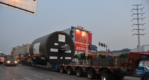 4日傍晚6時許,泉州市區南環路。一輛有著90個輪子的大運輸車,載著一個圓柱形的“巨無霸”,緩慢地在南環路上移動,引起交通堵塞。市民們紛紛稱奇:這個大家伙到底是什么?