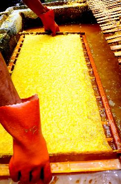 山東郯城馬頭鎮石站村土法制造草紙始于清末,距今已有100多年的歷史。據石站村92歲的草紙匠人張景運老人介紹,土法造紙起初使用的原料是麻,后改為麥秸,分為漚(麥秸)、煮(去石灰粉)、碾、漂、壓(水)、泡、沉(淀)、濾(漿)、晾(曬)9道工序。據介紹,90年代初,郯城草紙制造進入繁盛時期,全村300多戶一年可生產草紙700多萬刀,產值600余萬元。近年來,隨著科學技術的快速發展,這種土法造紙術逐漸淡出人們的視野。