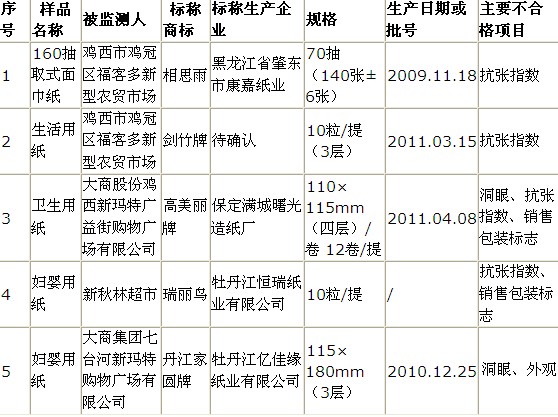 2011年二季度,黑龍江省工商行政管理局委托哈爾濱市產(chǎn)品質(zhì)量監(jiān)督檢驗(yàn)院依據(jù)《衛(wèi)生紙》GB20810—2006、《紙巾紙》GB/T20808—2006、《紙尿褲》QB/T2493-2000等標(biāo)準(zhǔn),對(duì)雞西、七臺(tái)河市的7家經(jīng)銷單位銷售的29批次衛(wèi)生紙、紙巾紙、紙尿褲的定量、亮度、橫向吸液高度、抗張指數(shù)、縱向濕抗張強(qiáng)度、柔軟度縱橫向平均、細(xì)菌菌落數(shù)、大腸菌群、致病性化膿菌、真菌菌落總數(shù)、交貨水份、洞眼、塵埃度、外觀、銷售包裝標(biāo)志等項(xiàng)目進(jìn)行了檢測(cè)。經(jīng)檢測(cè),合格23批次,合格率79%;不合格6批次,不合格率21%。
