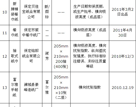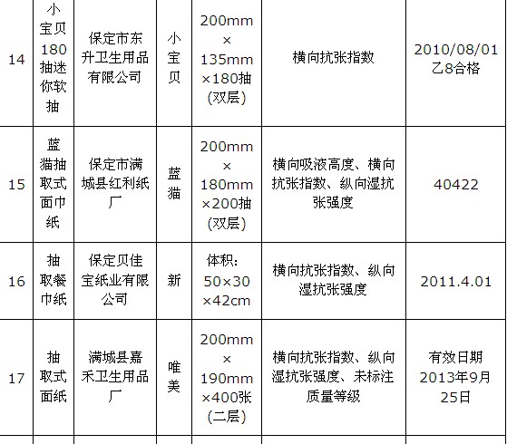本次紙巾紙檢驗(yàn)項(xiàng)目27項(xiàng)次,濕巾檢測(cè)項(xiàng)目21項(xiàng)次。不合格項(xiàng)目集中在強(qiáng)度包括橫向抗張指數(shù)和縱向濕抗張強(qiáng)度、橫向吸液高度等使用性能,也有部分商品標(biāo)識(shí)標(biāo)注不規(guī)范。涉及危害消費(fèi)者身體健康安全的項(xiàng)目包括塵埃度、細(xì)菌菌落總數(shù)、大腸菌群、致病性化膿菌(綠膿桿菌、金黃色葡萄球菌、溶血性鏈球菌)、真菌菌落總數(shù)等項(xiàng)目的合格率為100%。
