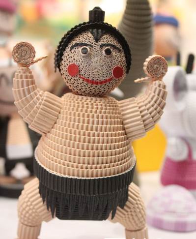 這些制作紙公仔的材料全部來自廢棄的紙箱和紙盒,通過加工、上色從而形成這種波紋紙。埔里造紙股份有限公司張健福介紹,這種環(huán)保紙公仔在臺灣很流行,深受年輕人的喜愛,簡單的制作流程、綠色環(huán)保材料加上獨特新穎的造型在動手動腦的同時亦陶冶了情操。