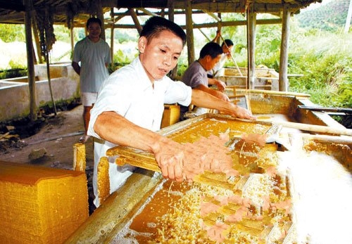 10月20日,筆者來到沙崗村,一進村便聽到造紙作坊里傳來“咚咚”的水輪機砸壓竹屑的聲音。走進作坊,只見水輪旋轉,村民們在忙碌地加工生產草紙,作坊里堆滿了產品。據南豐縣政協編著的《軍峰山志》記載:沙崗做草紙始于北宋年間,距今已有900多年歷史,是用軍峰山上的嫩毛竹為原料制作而成,由于產品采用傳統工藝,質量上乘,成為村民致富的一項產業。時至今日,這個村100余戶中有60多戶還在傳承著祖輩留下來的全手工造紙生產工序,年利潤達200多萬元。近日,市、縣文物工作者在進行非物質文化遺產調查時發現,沙崗村外山溪旁還保存的數十座百年造紙作坊,是中國古代四大發明之一的造紙術在民間不斷發展演變的實物例證,有非常重要的文物價值。