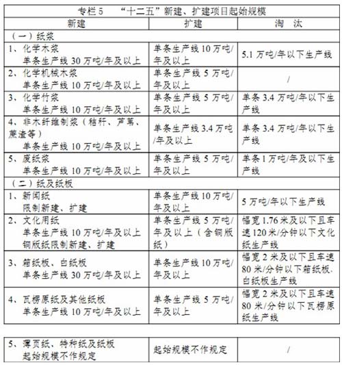4 、加快淘汰落后產(chǎn)能,減排減污。著力加快解決重點流域和重點區(qū)域的造紙工業(yè)結(jié)構(gòu)調(diào)整和污染問題,F(xiàn)有制漿造紙企業(yè)要進(jìn)一步加大力度淘汰污染嚴(yán)重的落后工藝與設(shè)備,抓緊技術(shù)改造,淘汰年產(chǎn)5.1萬噸以下的化學(xué)木漿生產(chǎn)線、單條年產(chǎn)3.4萬噸非木漿生產(chǎn)線和單條年產(chǎn)1萬噸及以下廢紙漿生產(chǎn)線,以及窄幅、低車速、高消耗、低水平造紙機(jī)。禁止采用石灰法地池制漿(宣紙除外)、限制新上項目采用元素氯漂白工藝(現(xiàn)有企業(yè)逐步淘汰),禁止進(jìn)口國外落后的二手制漿造紙設(shè)備。完善“三廢”治理設(shè)施,嚴(yán)格控制污染物排放。對經(jīng)限期治理仍不能達(dá)標(biāo)的企業(yè)或生產(chǎn)線要依法整頓或關(guān)停!笆濉逼陂g,繼續(xù)實行產(chǎn)業(yè)退出機(jī)制,調(diào)整和明確淘汰標(biāo)準(zhǔn),量化淘汰指標(biāo),加大淘汰力度。新增日處理污水能力300萬噸,淘汰紙及紙板落后產(chǎn)能1000萬噸以上。