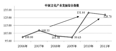 《報告》顯示,通過延展“十一五”時期的中國文化產業發展綜合指數至2011年,發現我國文化產業發展在2006年至2011年間處于總體的上升態勢。除2009年外,其余各年的CCIDCI值均大于100,根據CCIDCI指數的編制原理,這表明我國每年的文化產業總體發展均好于上一年。盡管如此,相比2010年,2011年CCIDCI指數值以128.70為第二高點,這表明我國文化產業總體依然保持平穩發展態勢。