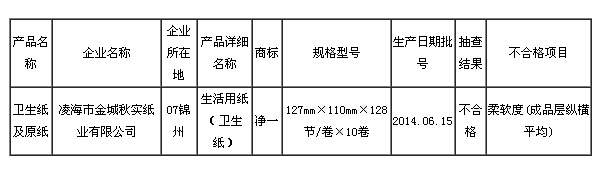 經(jīng)檢驗,凌海市金城秋實紙業(yè)有限公司的“凈一” 生活用紙(衛(wèi)生紙)(127mm×110mm×128節(jié)/卷×10卷 2014.06.15)柔軟度項目不合格。質(zhì)監(jiān)部門表示,不合格的主要原因是生產(chǎn)企業(yè)對產(chǎn)品標(biāo)準(zhǔn)的理解不夠,生產(chǎn)工藝控制不到位。