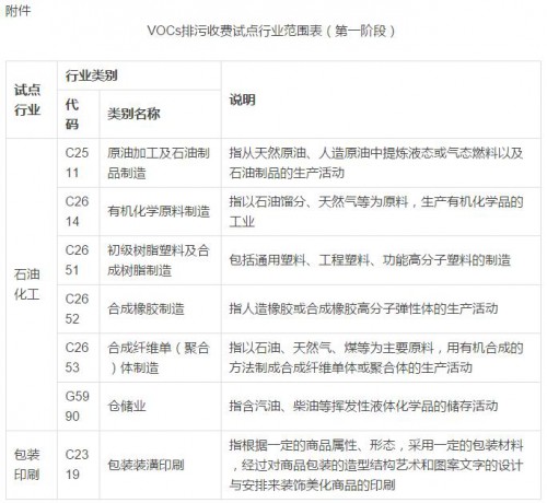 附件:VOCs排污收費(fèi)試點(diǎn)行業(yè)范圍表(第一階段)