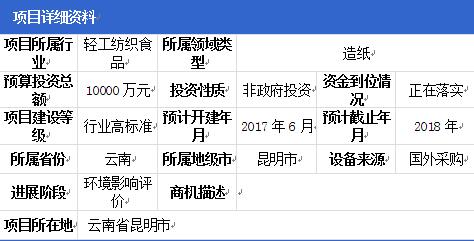 云南年產5萬噸生活用紙建設項目,該項目位于云南省昆明市。項目采用新建5條高檔生活用紙生產線,引進國內較為先進的造紙設備,采用外購成品的木漿和竹漿板,配少量助劑,生產高檔生活用原紙,車間占地面積約4000平方米。項目總投資10000萬元。