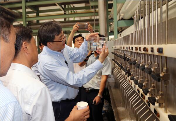 在城市中水回用車間,當(dāng)了解到這個項目可以有效回收利用城市生活污水處理廠的中水,每年可以節(jié)約1000多萬噸水資源時,王安德給予高度評價,認(rèn)為該項目除了節(jié)約大量淡水資源外,還減少了排污量,這也是未來的一個方向,有很強的示范引領(lǐng)意義。