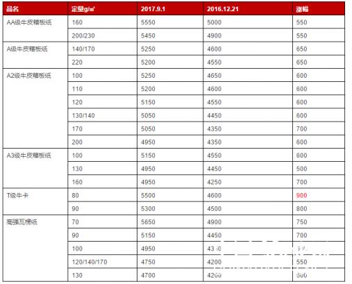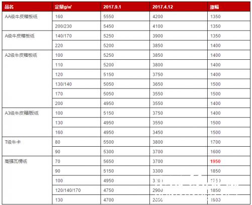AA級牛皮箱板紙:160g出廠價5550元/噸,200g、230g出廠價5450元/噸;