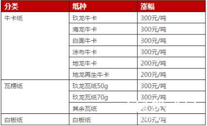 說明:調價執行時間為2017年9月26日-10月10日 東莞玖龍9月提價4次,國慶假期玖龍不發貨、金洲停機,廣東原紙供應或更緊張 9月1日,東莞玖龍紙業宣布所有?、瓦楞紙漲300元/噸,白板紙漲200元/噸,執行時間9月1日至9月10日。 9月10日,東莞玖龍再度上調價格,玖龍、海龍牌牛卡紙漲600元/噸,地龍、地龍再生箱板紙漲500元/噸;50、70克芯紙漲600元/噸,其他克重芯紙漲500元/噸;灰底白板紙漲300元/噸;白面?垵q500元/噸。(執行時間為9月11日至9月18日);天津玖龍低克重瓦楞紙漲600元/噸,其它箱板紙、瓦楞紙漲500元/噸。太倉玖龍瓦楞紙漲500-600元/噸。 9月18日,東莞玖龍再上調產品價格,其中,優質牛卡紙每噸再漲200元/噸,瓦楞紙/普通?埫繃嵲贊q100-150元/噸,執行時間為9月19日至9月25日。 9月21日,東莞玖龍本月第四次調價,玖龍牛卡、海龍?ā酌媾?、涂布?垵q300元/噸;地龍牛卡、地龍再生年卡漲200元/噸;玖龍瓦紙50、70克漲300元/噸,其余瓦紙漲200元/噸;白板紙漲200元/噸。 此外,國慶期間廣東地區的原紙供應可能會比較緊張。除了玖龍宣布10月1日-4日停止發貨4天外,另一規模造紙廠東莞金洲紙業也早就對外發布國慶假期停機檢修通知。按照計劃,該廠將于2017年10月1日-5日期間對電廠鍋爐進行升級改造,期間金洲高強芯紙、H紙、Q紙及銀洲T紙暫停生產。東莞金洲紙業目前總產能超105萬噸。 旺季來臨,原料價格高企,造紙行業將迎全面漲價 造紙行業旺季已經來臨,9月份到年底節日較多,購物潮引發紙品需求增多。廢紙、紙漿等原材料價格居高不下,行業面臨全面漲價。目前,造紙企業基本處于零庫存態勢,下游企業爭相囤貨。 箱板瓦楞紙方面,外廢進口配額緊張,產業鏈庫存處低位,疊加節日需求提前備貨,9月上旬箱板瓦楞紙價格大幅上漲。在外廢配額無新批復額度的情況下,箱板瓦楞紙價格存在來自成本端的支撐;即便出現新一批的外廢增補額度釋放,紙價也難以高位回落。 業內人士表示,年內第二批增補額度數量有限,最多為全年外廢額度的10%,且海外廢紙到岸需1.5-2個月時間。在環保監管趨嚴,旺季需求增加的情況下,四季度箱板瓦楞紙仍將處于供需緊狀態。