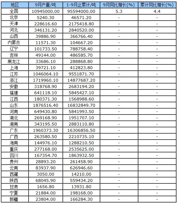 1-9月全國機制紙及紙板產量9559.4萬噸
