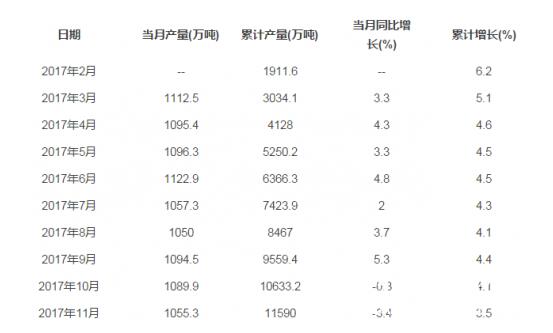 11月,紙及紙板產(chǎn)量1055.3萬噸,同比2016年下降了3.4%,下降幅度比較明顯。同時,2017年前11個月紙及紙板累計(jì)產(chǎn)量11590萬噸,同比2016年增長了3.5%,盡管增幅仍然明顯,但是對比2017年前10個月,生產(chǎn)總量增長幅度首次跌破4%。