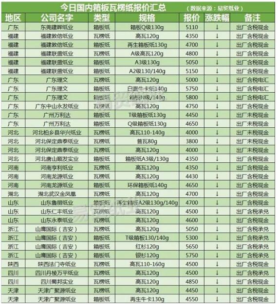 (來(lái)源于易貿(mào)紙業(yè)) 商丘嘉盛紙業(yè):6月5日A級(jí)箱板紙價(jià)格下調(diào)。110g報(bào)4400元/噸,125g報(bào)4300元/噸,155g報(bào)4250元/噸,195g報(bào)4200元/噸。(出廠價(jià)) 上海兆美紙業(yè):6月5日瓦楞原紙價(jià)格下調(diào)100元/噸。140g瓦楞紙報(bào)4400元/噸。(出廠價(jià)) 廣東理文紙業(yè):6月4日高瓦120g報(bào)5000元/噸,白面牛卡紙140g報(bào)5750元/噸,箱板N級(jí)140g報(bào)5800元/噸(出廠含稅電匯價(jià))。 東莞建暉紙業(yè):6月4日箱板Q級(jí)130g報(bào)5110元/噸。(出廠含稅現(xiàn)金價(jià)) 中山永發(fā)紙業(yè):6月4日高瓦120g報(bào)4750元/噸。(出廠含稅現(xiàn)金價(jià)) 廣州萬(wàn)利達(dá)紙業(yè):6月4日T級(jí)箱板紙130g報(bào)4450元/噸,Q級(jí)箱板紙130g報(bào)4650元/噸。(出廠未稅現(xiàn)金價(jià)) 山鷹國(guó)際(吉安):6月4日高瓦120g報(bào)5050元/噸,T級(jí)箱板紙130g/140g報(bào)5300元/噸,紅杉120g報(bào)5650元/噸,銀杉120g報(bào)5750元/噸。(出廠含稅承兌價(jià)) 福建聯(lián)盛紙業(yè):6月4日A級(jí)高瓦120g報(bào)4800元/噸,A3級(jí)箱板紙130g報(bào)5050元/噸,A2級(jí)箱板紙130/140g報(bào)5150元/噸。(出廠含稅現(xiàn)金價(jià)) 福建敦信紙業(yè):6月4日高瓦120g報(bào)4350元/噸,再生箱板紙130g報(bào)4700元/噸。(出廠含稅現(xiàn)金價(jià)) 河北柏鄉(xiāng)縣華興紙業(yè):6月4日高瓦110-140g報(bào)4000元/噸。(出廠未稅現(xiàn)金價(jià)) 河北保定鼎泰紙業(yè):6月4日普瓦80g報(bào)3800元/噸,高瓦120g報(bào)4000元/噸。(出廠未稅現(xiàn)金價(jià)) 河北唐山順發(fā)實(shí)業(yè):6月4日箱板紙A3級(jí)/130g報(bào)4350元/噸。(出廠含稅現(xiàn)金價(jià)) 河南亨利紙業(yè):6月4日高瓦120g報(bào)4350元/噸。(出廠含稅現(xiàn)金價(jià)) 河南龍?jiān)醇垬I(yè):6月4日高瓦120g報(bào)4430元/噸,環(huán)保箱板紙140g報(bào)4650元/噸。(出廠含稅現(xiàn)金價(jià)) 湖北武漢金鳳凰:6月4日高瓦120g報(bào)4700元/噸。(出廠含稅現(xiàn)金價(jià)) 山東魯麗紙業(yè):6月4日再生箱板紙A2級(jí)130g/140g報(bào)4700元/噸。(出廠含稅現(xiàn)金價(jià)) 山東仁豐紙業(yè):6月4日高瓦120g報(bào)4500元/噸。(出廠含稅承兌價(jià)) 山東永泰紙業(yè):6月4日高瓦120g報(bào)4600元/噸。(出廠含稅現(xiàn)金價(jià)) 陜西法門(mén)寺紙業(yè):6月4日高瓦110g-160g報(bào)4500元/噸。(出廠含稅現(xiàn)金價(jià)) 四川丹棱萬(wàn)平紙業(yè):6月4日高瓦120g報(bào)4500元/噸。(出廠含稅承兌價(jià)) 四川蜀邦實(shí)業(yè):6月4日高瓦120g報(bào)4850元/噸。(出廠含稅現(xiàn)金價(jià)) 天津廣聚源紙業(yè):6月4日高瓦120g報(bào)4450元/噸,再生牛卡130g報(bào)4550元/噸。(出廠含稅現(xiàn)金價(jià)) 浙江杭州民興紙業(yè):6月4日灰底白板紙250g報(bào)4260元/噸,300g報(bào)4110元/噸,350g報(bào)4010元/噸。(出廠含稅價(jià)) 河北保定金南紙業(yè):6月3日高瓦110g報(bào)4200元/噸,普瓦80g報(bào)4000元/噸。(現(xiàn)金含稅出廠價(jià)) 天津玖龍紙業(yè):6月3日玖龍瓦楞紙120-170g報(bào)4650元/噸,110g報(bào)4800元/噸,90g報(bào)5000元/噸,70g報(bào)5200元/噸;海龍瓦楞紙120g\130g\140g報(bào)4500-4600元/噸。(含稅電匯出廠價(jià)) 江蘇丹陽(yáng)長(zhǎng)豐紙業(yè):6月3日箱板紙T級(jí)110g報(bào)5300元/噸,120g報(bào)5200元/噸,160g報(bào)5150元/噸。(一般出廠含稅承兌價(jià))