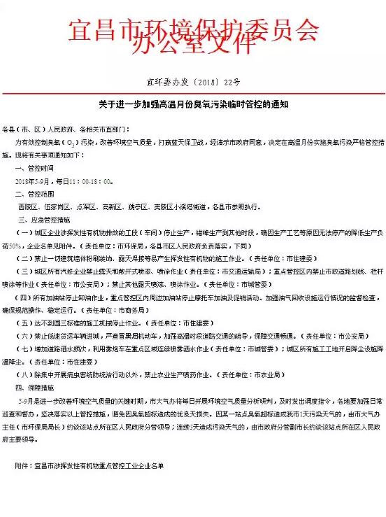 全國多地紛紛出臺政策,要求相關企業停限產 湖北省宜昌市 宜昌市環保局印發《關于進一步加強高溫月份臭氧污染臨時管控的通知》,通知要求在5-9月,每日11:00-18:00,城區工業企業涉揮發性有機物排放的工段(車間)停產,確因生產工藝等原因無法停產的實行錯峰生產(限產50%),禁止低速貨運車輛進城,嚴查冒黑煙機動車。