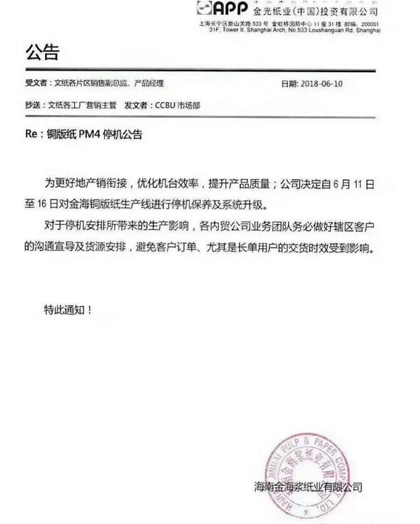 繼玖龍、理文等紙廠停機后,湖北龍頭紙企金鳳凰宣布停機17天之久。文化紙方面也有華泰、晨鳴紙業等大型紙廠相繼停機,今日又新增APP、太陽紙業停機,實在是熱鬧!至此市場已有近10多家紙廠停機檢修,幾乎都是各地龍頭企業。原因是什么?停機函上都說是廢紙短缺影響,也有說是按計劃停機。各地龍頭紙廠一反常態紛紛年中停機檢修,真的是因為缺廢紙嗎?這篇文章將為您揭開真相! 新增的文化紙漲價函: