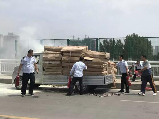 6月10日,車水馬龍的安徽省阜陽市潁東區北京路立交橋上,一輛小貨車貨架上突然起火,濃煙滾滾。消防官兵趕來前,一位市民和8名公交車駕駛員先后投入滅火中,9人用完20罐滅火器,成功將明火撲滅。