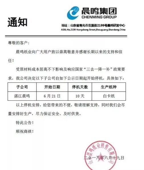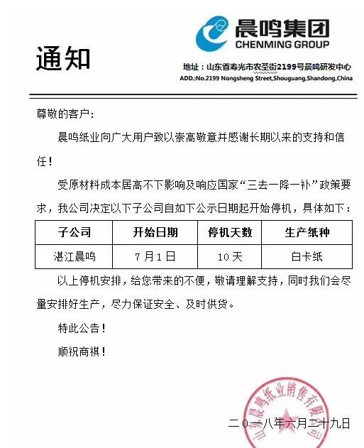 環(huán)保因素、成本上升導致供給端有所減弱,但是需求增速放緩幅度要更為明顯,這對生產企業(yè)而言,顯然不是什么好消息。面對持續(xù)陰跌的成品紙價格,各家龍頭紙企開始聯手保價,但是,“停產保價”短期內能起到的效果無非是止住跌勢,真正的轉機仍需等待需求端的明顯好轉。 晨鳴集團7月份再停白卡紙機!