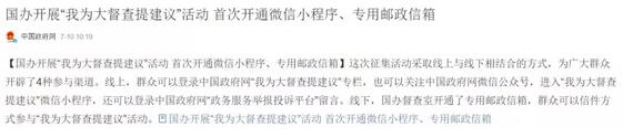 時間:7月10日-9月10日 國務院提供了4種渠道,分別是: 1、中國政府網:我為大督查提建議 2、微信小程序 3、郵寄信件:地址:北京市17980信箱,郵政編碼:100017 4、登錄中國政府網:政府服務舉報投訴平臺 有微信的朋友,可以按照下面順序即可進入“我為大督查提建議”的微信小程序: 路徑:打開微信→錢包→城市服務→國務院大督查