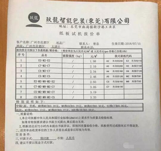 7月15日,玖龍智能包裝(東莞)有限公司的一份《紙板試機報價單》在坊間流傳。該報價單的價格比同行至少低10%,且報價含稅,但前提是預付款。 在當前市場需求匱乏的現(xiàn)狀下,該份報價在一定程度上影響到紙板行業(yè)的營利狀況,對市場秩序造成較大影響。