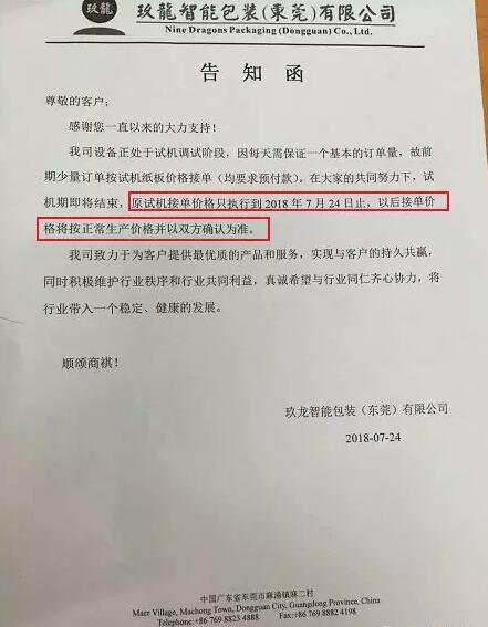 為此,7月19日,珠三角紙板廠協(xié)會(籌)發(fā)出《倡議書》,用生動詳細的語言分析了二級紙板廠的成本及目前面臨的困境,號召同行攜手維護市場秩序。詳見:一級紙廠超低價搶訂單,紙板協(xié)會怒發(fā)倡議書,不做“待宰羔羊”。 時隔三日,7月22日,玖龍高層正面與珠三角紙板廠協(xié)會(籌)直接溝通,認同協(xié)會對維護行業(yè)正常合理的利益所做的努力,表示愿共同維護正常有序的競爭環(huán)境。 7月24日,玖龍包裝發(fā)出最新告知函,表示:原試機接單價格只執(zhí)行到2018年7月24日止,以后接單按正常生產(chǎn)價格并以雙方確認為準。