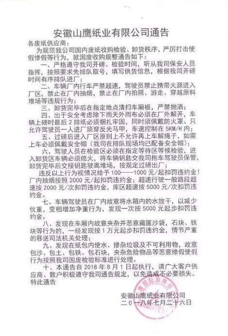 圖片來(lái)源于99廢紙網(wǎng) 不過(guò),作為一個(gè)自由化程度相對(duì)較高的市場(chǎng),紙價(jià)走勢(shì)總體上還是由市場(chǎng)供需決定的!這不,漲聲未落,珠三角廢紙價(jià)格又不爭(zhēng)氣地下跌了。 【易跌難漲】 珠三角國(guó)廢再次下跌 如果說(shuō)2016年的紙價(jià)瘋漲的發(fā)起點(diǎn)是靠雙十一需求外,2017與2018年的瘋漲則基本上靠龍頭的集體拉抬,環(huán)保關(guān)停的助力和市場(chǎng)投機(jī)心理。 特別是到了2018年,受到產(chǎn)能擴(kuò)張和需求萎縮的雙重影響,即便不算可能高達(dá)千萬(wàn)噸的存量,包裝紙的生產(chǎn)也已經(jīng)明顯供大于求。因此,我們就不難理解為什么紙價(jià)為何易跌難漲的原因了。 這不,市場(chǎng)漲聲未落,國(guó)廢就已經(jīng)掉頭向下! 【金洲紙業(yè)】 7月31日起降50元 一級(jí)紙2800 (一級(jí)紙為純工廠紙邊、純工廠紙、大煙箱紙、純黃紙皮、商場(chǎng)黃紙) 二級(jí)紙2700(黃紙花紙比例80/20); 三級(jí)紙2600(花紙比例20%-50%); 特此通知! 【東莞玖龍紙業(yè)】 7月31日起,黃紙皮下調(diào)80元每噸,白廢紙不變,廢紙到廠價(jià)格如下: (1)A級(jí):2900元/噸(下調(diào)80元); (2)B級(jí):2850元/噸(下調(diào)80元); (3)C級(jí):2800元/噸(下調(diào)80元); (4)D級(jí):2550元/噸(下調(diào)80元); (5)坑紙:2550元/噸(下調(diào)80元); 其它不變 【安徽山鷹紙業(yè)】