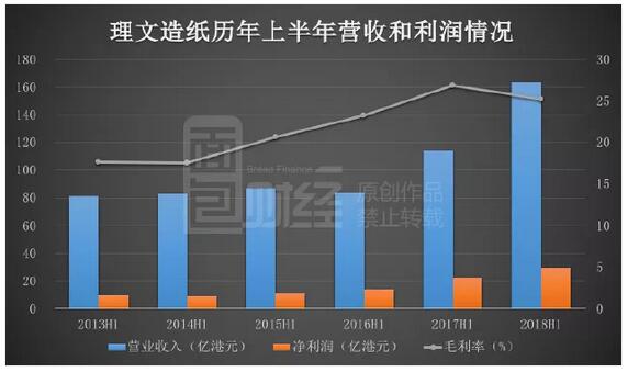 早在此次中期業績披露之前,理文造紙的股價已經經歷一波大跌:從2018年5月中旬的9.58港元一路跌至7月中旬的6.46港元,2個月時間跌幅達32.57%,隨后股價才開始回調。 事實上,可以看到理文造紙的這場大跌趨勢最早要追溯到2017年的9月中旬,按當時最高復權股價10.71港元來算,至今年7月中旬已經下跌近40%。 那么,理文造紙在這近一年里到底發生了什么?是什么讓市場對其靚麗業績不買賬?先來看最新的中報業績。 業績速讀:營收利潤雙雙創新高,毛利率5年來首次下滑 根據理文造紙中報披露,今年上半年共銷售產品295萬噸,同比增長6.5%,每噸利潤為1009港元,同比增長27.4%,紙品利潤單價創下新高。今年上半年,理文造紙的營收和凈利潤也都創下歷史新高: