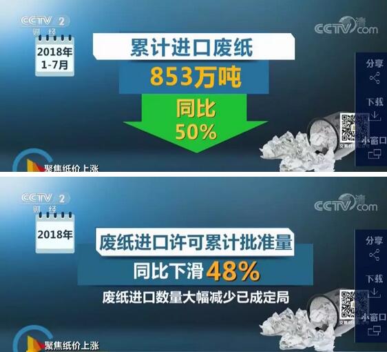 從海關公布的廢紙實際進口數據來看,2018年1-7月廢紙累計進口853萬噸,同比下滑50%。與此同時,2018年廢紙進口許可累計批準量同比下滑48%,廢紙進口數量大幅減少已成定局。 受此影響,8月下旬以來,多家企業將廢紙價格上調50元-100元/噸,最高達3400元/噸。