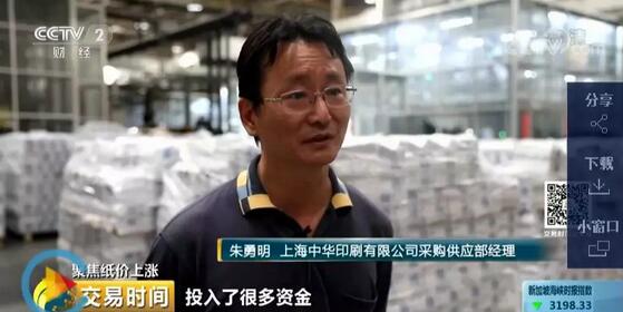 上海中華印刷有限公司采購供應部經理朱勇明:我們今年為了準備教材的紙,投入了很多資金,把正常的資金使用都搞得很緊張。紙張庫存壓力也很大,不買到時候又會漲,活來的時候這個紙價就承受不住。 記者了解到,每年上海市中小學教材的用紙量在一萬噸左右。目前,膠版紙的批發價已經漲到了每噸7250元,工廠擔心漲價提前囤貨800噸,為明年春季的教材做準備。而對于高白輕涂紙等一些特殊紙張,紙廠還設置了1000噸的起做標準,同時要求付清錢款才開始生產,交貨周期從一個禮拜延長到了一個月。 上海中華印刷有限公司采購供應部經理朱勇明:原先這種情況,我們在采購做了這么多年從來沒碰到,我們訂的教材紙也是要預先付錢,紙廠才會安排生產。有些要全額付掉,有些要付部分訂金。以前不用,以前是有一個付款周期的,訂貨,三個月以后付賬,現在是要先收到錢,然后才會安排生產。 龍頭紙企估值不足十倍,產能釋放導致盈利下行 造紙行業是非典型的周期性行業,行業景氣度與國家政策、市場供需密切相關。工信部數據顯示,2018年1-6月,全國造紙行業累計主營業務收入4285.1億元,同比增長12.5%;累計利潤總額272.4億元,同比增長16.6%。目前造紙行業上市公司2018年中報已經披露完畢,相關的個股的業績表現和估值情況如何呢? 目前,A股市場造紙板塊共有22家上市公司,總市值超過1500億元,市值排名前五的公司分別是太陽紙業、晨鳴紙業、山鷹紙業、仙鶴股份以及中順潔柔,市值均超過百億,在板塊總市值中占比超過50%,行業集中度較高。