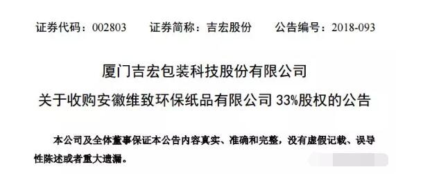 2018年9月12日,廈門吉宏包裝科技股份有限公司公告稱,已與寧波梅山保稅港區(qū)宏恪投資管理合伙企業(yè)簽訂《股權(quán)轉(zhuǎn)讓協(xié)議》,約定以人民幣1075萬元的價格收購寧波宏恪持有安徽維致環(huán)保紙品有限公司33%的股權(quán)。