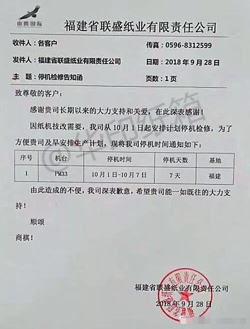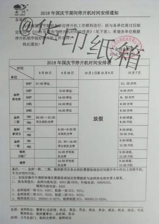 1、福建省聯(lián)盛紙業(yè)PM33:停機(jī)7天 我司從10月1日起安排計劃停機(jī)檢修,P33停機(jī)時間:10月1日至10月7日。 2、廣東中山永發(fā)紙業(yè):停機(jī)2天 由于我司技術(shù)升級改造,我司從9月29日—9月30日停機(jī)。 3、中山聯(lián)合鴻興造紙:停機(jī)3天 由于我司技術(shù)升級改造,我司從10月1日—10月3日停機(jī)。 4、東莞金洲紙業(yè):停機(jī)7天 9月30日至10月06日所有機(jī)臺停機(jī)休假。 5、東莞金田紙業(yè):停機(jī)7天 10月01日至10月07日因鍋爐設(shè)備需要進(jìn)行安全維修,期間紙機(jī)將全面停機(jī),暫停生產(chǎn)。 6、江門豐達(dá)/明星:停機(jī)25天 9月15日至10月10日進(jìn)行紙機(jī)技術(shù)改造及電站檢修維護(hù),全廠停機(jī)25天。 7、佛山金盛聯(lián)合紙業(yè):9月28日起停機(jī) 廣東佛山金盛聯(lián)合紙業(yè)2018年9月28日起停產(chǎn)檢修,檢修期間廢紙暫停收購,具體收貨時間另行通知,請知悉! 9月30日起停機(jī) 2018年國慶節(jié)停開機(jī)時間安排如下,9月29日20:00-21:00金洲二期PM3、PM4兩臺紙機(jī)全停;9月30日13:00-14:00金洲一期PM1、PM2兩臺紙機(jī)全停;9月30日8:00-9:00銀洲新項(xiàng)目PM1、PM2兩臺紙機(jī)全停;9月30日銀洲白板廠所有紙機(jī)全停;9月30日14:00東莞建樺所有紙機(jī)全停。10月1日-6日放假。