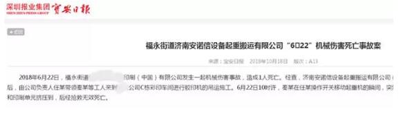 廣東:知名印刷廠發生機械死亡事故,被安監局調查 據寶安日報2018年10月18日報道,因廣東某知名印刷公司發生一起機械死亡事故,引起了廣東省深圳市寶安區安監局的高度重視。經調查取證,最終于2018年9月11日對承接該印刷公司設備吊裝作業的搬運公司處以罰款22萬元。 雖然這次這家包裝印刷公司沒有遭受罰款,但在業內的名譽卻受到了損失。一些業內同行得知該廠安全事故頻發后,質疑其公司管理能力,甚至是不愿讓同行去該廠打工。 事情經過:2018年6月22日,福永街道XX印刷(中國)有限公司發生一起機械傷害事故,造成1人死亡。經查,濟南安諾信設備起重搬運有限公司(以下簡稱“安諾信公司”),承接設備吊裝作業后,由公司負責人任某帶領秦某等工人來到XX印刷公司C棟彩印車間進行膠印機的吊運施工。6月22日10時許,秦某在任某操作開關移動起重機的瞬間,突然從印刷單元上站起來,導致其頸部被移動的橫梁和印刷單元擠壓到,后經搶救無效死亡。 經事故調查組調查并經區政府批復,認定造成事故發生的直接原因為工人秦某安全意識淡薄,在未告知現場管理人員的情況下私自蹲在印刷單元上進行吊具拆除作業,在未確認安全的情況下突然站立,導致其頸部被移動的橫梁和印刷單元夾到而死亡。間接原因為安諾信公司安全管理不到位,未對秦某進行安全教育和培訓,且未制定涉事設備的安全操作規程,未告知工人工作場所存在的危險因素和防范措施。根據上述查明事實,依據《中華人民共和國安全生產法》第二十五條、第四十一條和第一百零九條第(一)項的規定,區安監局于2018年9月11日對該公司處罰款22萬元。 寶安區安監局提示:安全操作規程是指在生產活動中,為消除導致人身傷亡或者造成設備、財產破壞以及危害環境的因素而制定的具有技術要求和實施程序的統一規定。安全操作規程是保證生產經營活動安全進行的重要制度保障,從業人員在進行作業時必須嚴格遵守。從事操作機械作業的生產經營單位應當加強員工的安全生產教育和培訓工作,增強員工的安全意識,制定員工操作機械的安全操作規程,告知員工操作機械可能存在的危險因素以及相關的防范措施。