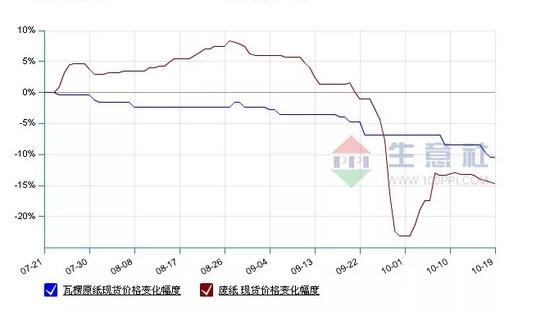 除了瓦楞紙和廢紙外,其他紙種和原材料近期價格走勢又如何呢?先看原材料紙漿,據國際統計局統計,紙漿(漂白化學漿)全國市場價今年一直在6000元/噸之上,最高曾到6510元/噸,目前最新一期統計數據是6319元/噸,依然處于歷史高位。除此之外,歐洲北方漂白針葉漿等進口紙漿的價格也一直在上揚。由此看來,紙企成本端壓力并沒有釋放,甚至還有些上浮。 去年、前年,造紙業進入四季度旺季,均是一路提價至下一年初,全年價格高點也往往出現于此時段。但在今年,各類紙品沒有延續前兩年的規律,價格反而出現松動,無論銅版紙、雙膠紙,目前相比今年5月份,都有明顯下滑,跌價幅度在500元/噸左右。 紙價大幅回撤,“洛陽紙貴”行情終結,行業拐點又至? 曾經“洛陽紙貴”的行情似乎已經終結,一位紙業人士向記者表示,之前一紙難求,下游印刷包裝企業一直在備貨,生怕進入產業旺季后價更高、貨更少,前期訂單透支,也許是造成淡季不淡、旺季不旺的原因之一。 在該人士看來,紙價高企,給下游企業生產成本壓力過大,也是造成需求放緩的原因之一。目前在造紙業各大報價系統上,下調出廠價已經成為主流。不乏有大型紙企宣布暫停各級箱板紙收購,再收購時間也沒有具體計劃。 上證報記者了解到,曾經的“廢紙炒家”如今也在拋售手中存貨。有廢紙打包廠經營者向記者吐槽:“之前國廢價格漲得厲害,我們這兩年一直是收來廢紙后,存一部分,賣一部分,現在大的紙廠提高了回收標準,含雜率高的、含水量大的都拒收了,回收價經常一天一變。現在手里一大部分存貨都是之前高點收的,現在折點價也想把手里貨清出去。” 當廢紙突破3000元/噸的時候,這個市場就已經“禮崩樂壞”,價格回歸只是時間上的早晚。紙企開始拒收廢紙,也是紙企原材料開始變得充沛的寫照。在原材料端,大型紙企不僅在外廢配額上具有先發優勢,面對原材料不足的準備也更充分,如玖龍紙業今年5月就斥資1.75億美元,在美國收購了一家紙漿廠。 紙價下跌對上市公司影響幾何,尚需等待紙企三季報出爐核驗。前述人士表示,“瓦楞紙價格大幅回撤,旺季價格滯漲,不排除就是紙業的又一次的拐點。” 預計未來紙價漲少跌多,整體行業進入整合階段 據生意社數據監測:上周(10.15-10.19)廢紙價格以震蕩下行為主,但是大多數紙廠還是維持淡穩運行。10月19日廢黃板紙市場均價為2405.71元/噸,與周初相比下調1.46%。而瓦楞原紙價則呈現了小幅下調趨勢。10月19日瓦楞原紙出廠價格均價為3793.33元/噸,與周初相比下調2.15%。 通過觀測市場變化來看,國廢價格在進入十月份之后,月初市場出現明顯回漲,將前期大跌的價格重新拉至上升通道,然而由于支撐上漲動力不足,目前來看后市市場還是呈現震蕩下行的狀態。上周北方市場多以觀望平穩為主,只有少數紙廠以自身價格調整為主。而南方市場自中旬開始持續呈弱穩態勢運行。從南北方國廢市場表現來看,可以明顯看出紙廠對國廢采購的意愿并不強烈,且普遍保持觀望的態度。 10月18日第22批核定廢紙進口量的發布,給緊張的外廢市場帶來很大緩和。而這次廢紙進口總量為201.2821萬噸,核定總量在目前年定公布批次中排名第三,核定工廠數量年內最多。因此對國廢價格將會起到一定程度的影響。  數據來源:中國固廢化學品管理網 同時,上周瓦楞原紙的價格則出現了一定幅度的下調,原紙價格的持續下調主要還是由于成品紙銷售的滯緩。自五月份之后瓦楞紙表觀消費量需求同比呈現下滑趨勢,市場需求遠超預期低迷,市場整體呈現供大于求,紙廠也都在降低庫存,避免風險。再加之廢紙原材料的價格依舊持續走低,導致成本降價,因此原紙價格也隨之下調。 生意社紙張分析師認為,秋冬季各項污染檢查絡繹不絕,環保嚴查開始啟動,大多中小廠家均有停機停產可能,影響國廢采購需求。各地紙廠成品紙庫存仍處高位,因此廢紙需求方面將是大打折扣。而瓦楞原紙方面下游需求也是一直處于低迷狀態,從四季度中美貿易爭端將打壓紙包裝需求的角度看,此下滑趨勢恐將延續。預計未來價格可能漲少跌多,整體行業進入整合階段。