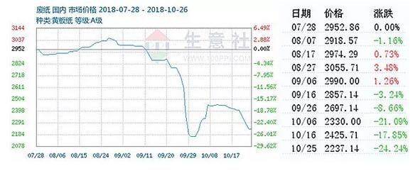 廢紙已下調2000元/噸,數年難遇,廢紙商倉皇逃離 齊魯晚報記者了解到,自農歷八月十五以后,廢品價格開始大幅走低,至今仍持續低迷。從事廢品收購多年的徐先生坦言,近幾年紙盒類還沒有如此大幅度的降價,直接導致每日收購量大幅縮減。 “降價之前每日至少收購1000斤,F在自從紙盒大幅降價后每日最多600斤。”徐先生稱,明顯感覺到除了一些剛裝完修必須售賣的紙盒外,好多市民咨詢完價格后表示再等等。因為掙得少,身邊很多同行已經不干了。 事實也確實如此,近一個多月以來,廢紙價格急轉直下,開啟跌跌不休模式。華印小編發現:以山東地區為例,10月25-26日,包括昌樂世紀陽光紙業、東營華泰紙業、天地緣紙業等在內的數家紙企仍在下調廢紙收購價格,下調幅度集中在50元/噸,下調后的廢紙箱價格在1600-2500元/噸。這個價格與今年廢紙高位價格3300元/噸相比,最高下調了1700元/噸。而在廣東市場目前廢紙價格仍在下調,當前價格在1800-2500元/噸左右。相比今年5月3800-3900元/噸的價格高點,最高已下調了2000元/噸,這個幅度確實令人咋舌。 此外,據生意社數據監測:10月25日國內廢黃板紙市場收購價格繼續延續著前幾天的下行趨勢,當日均價為2237.14元/噸,下調價格在30-100元/噸左右,與7月底相比跌幅高達24.24%。