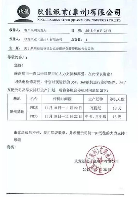 雙十一大戰(zhàn)即將打響! 數(shù)十億套個包裹,數(shù)十億的包裝 紙包裝業(yè)滿以為可以撒歡狂歡一把 然鵝! 狂歡?不存在的! 電商包裝的一枝獨秀無法掩蓋整體需求的低迷, 大半年積存的庫存壓力終究要釋放的。 于是乎, 一手“停機削供給”,一手“降價去庫存”的胡蘿卜加大棒政策出臺了 ▼▼▼ 吶! 💥中國包裝紙行業(yè)的龍頭老大及舵手💥 💥產(chǎn)能占據(jù)中國包裝紙產(chǎn)能四分之一強的紙業(yè)巨頭💥 ······· 玖龍紙業(yè)再一次宣布降價了! 絕對的風向標!!!