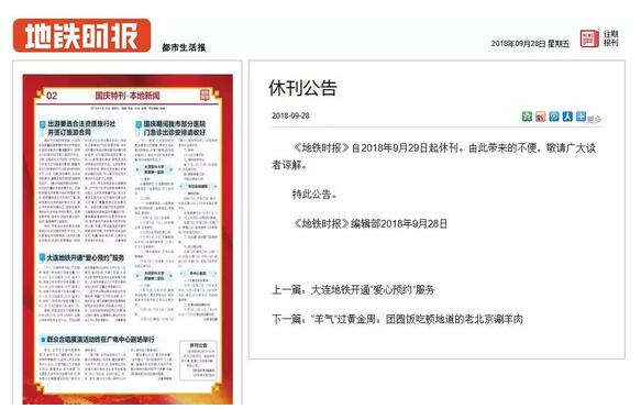 值得注意的是,大連《地鐵時報》休刊是今年8月,大連報業(yè)集團、大連廣播電視臺、大連京劇院、大連舞美設(shè)計中心、團市委宣傳教育中心等11家單位重組為大連新聞傳媒集團后,大連首個宣布休刊的媒體。 公開資料顯示,地鐵時報是由大連報業(yè)集團于2015年5月22日創(chuàng)刊,是大連新聞史上具有開創(chuàng)意義的第一份地鐵報,被譽為大連市“地鐵族”的第一讀本、白領(lǐng)生活的深度介入者。另有消息稱:按照新組建的大連新聞傳媒集團的規(guī)劃,到今年年底,《新商報》也將休刊,《大連晚報》將開始縮版。